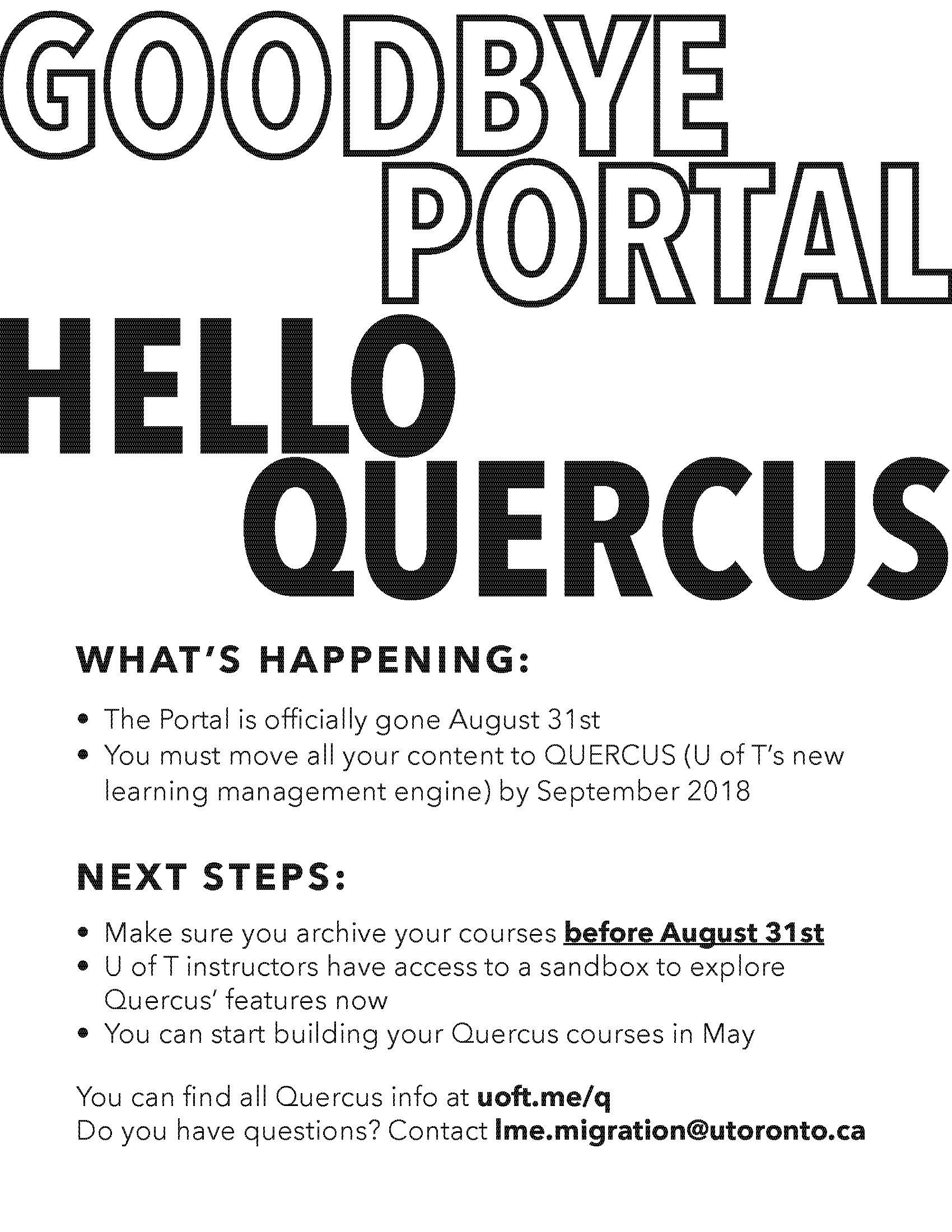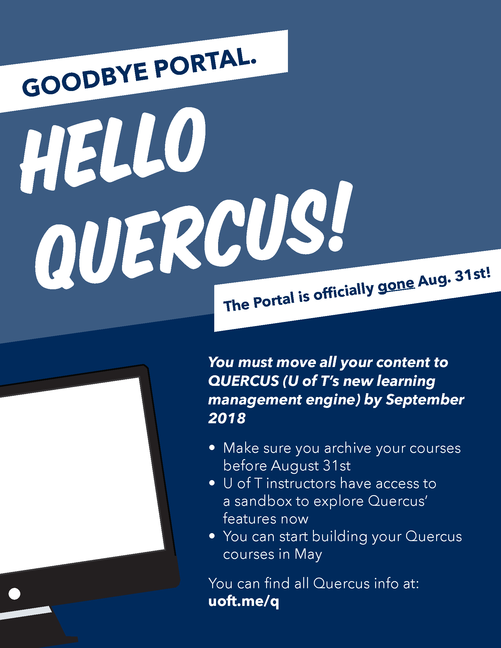 As we prepare for our final session with some courses offered through the Portal the message is clear that after August 31st Quercus will be the University of Toronto’s new and only Learning Management Engine. You can help spread the word by sharing these awareness posters.